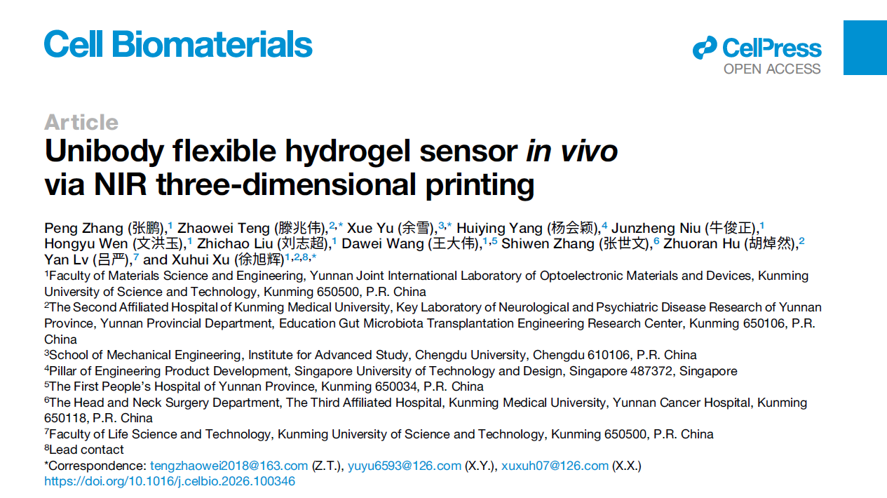 日前,昆明理工大学材料科学与工程学院徐旭辉教授团队取得突破性进展,借鉴微晶玻璃结构模型研发了植入式微晶水凝胶传感器,探索了近红外3D打印技术实现传感器的体内原位无创构建,在细胞出版社旗下旗舰期刊Cell姊妹刊《Cell Biomaterials》杂志在线发表了题为“Unibody flexible hydrogel sensor in vivo via NIR three-dimensional printing”的工作。昆明理工大学为第一作者单位,通讯作者是昆明理工大学徐旭辉教授、昆明医科大学滕兆伟教授。文章第一作者是无机系青年教师张鹏。该研究得到国家自然科学基金项目、云南省重大科技专项等项目资金支持。