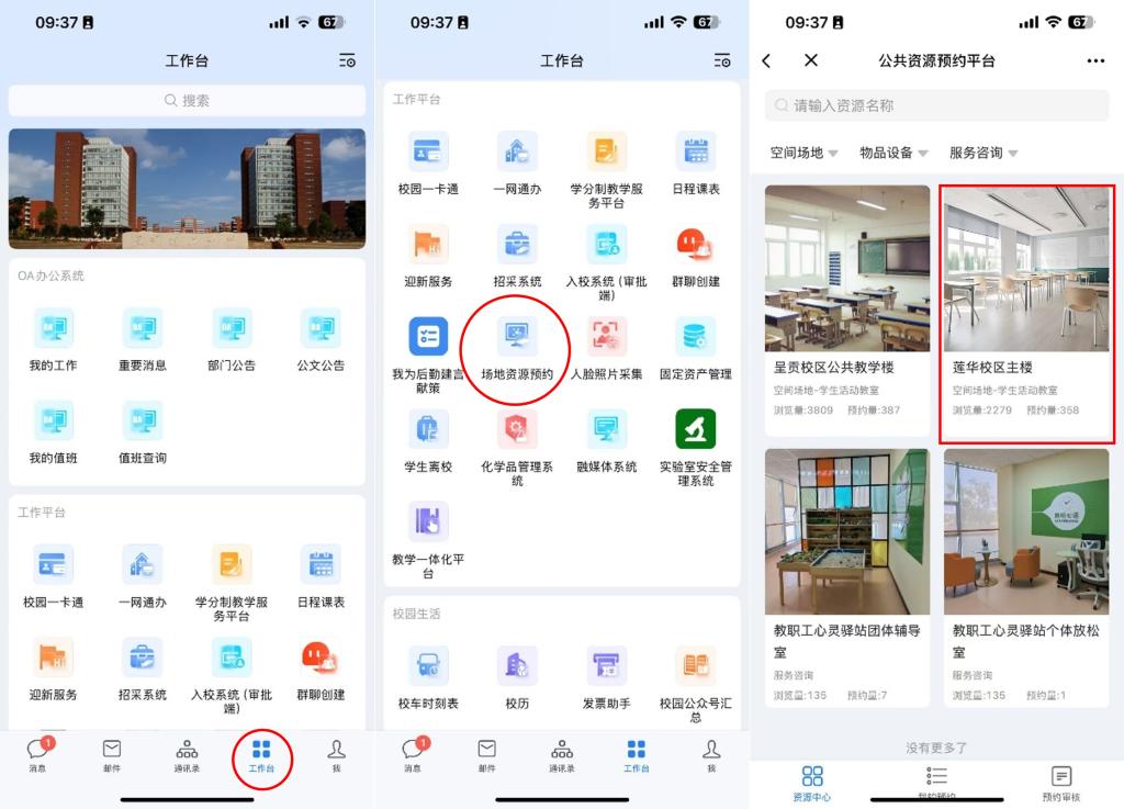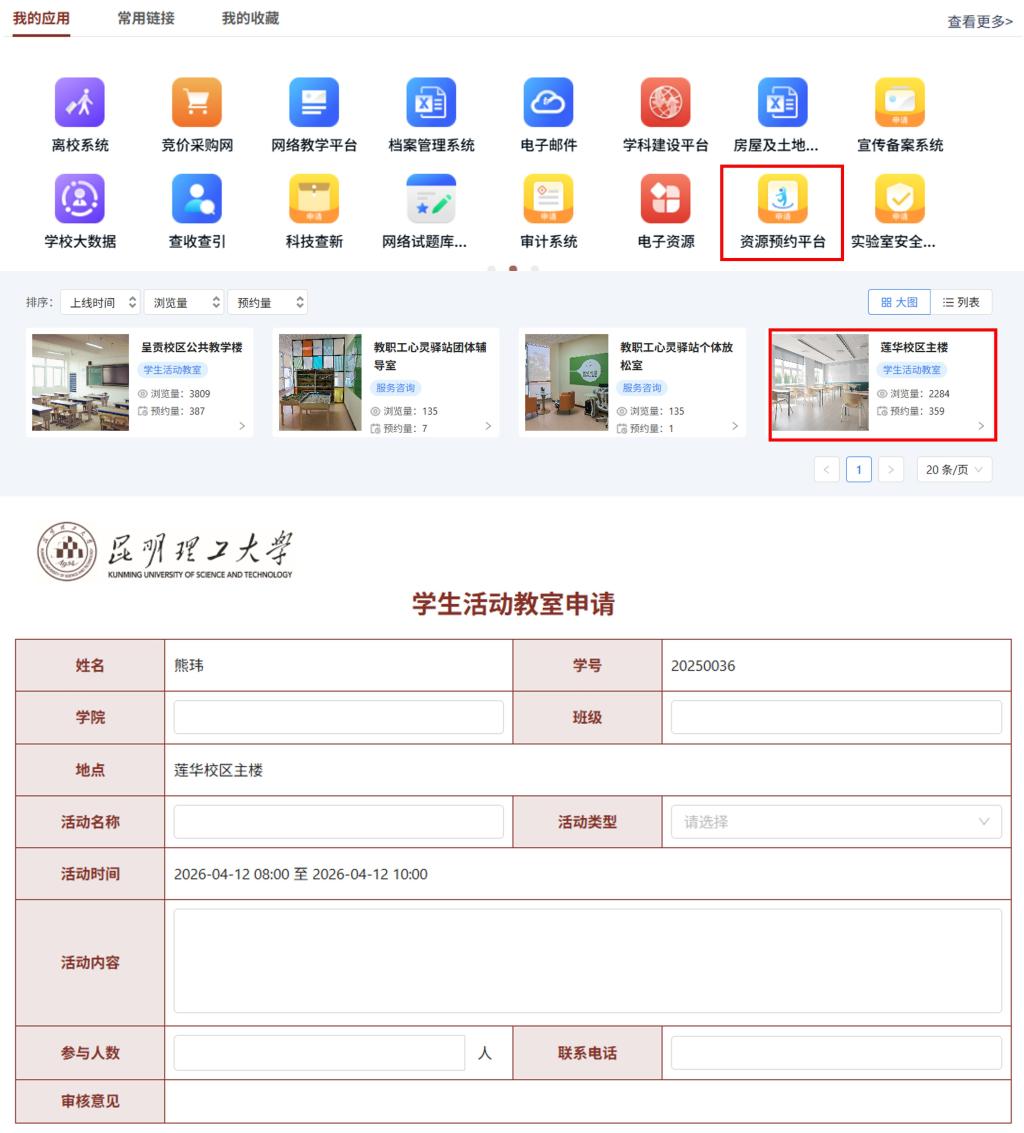 (1)登录“师生信息服务平台”后,在主页找到“我的应用”栏目中的“资源预约平台”。