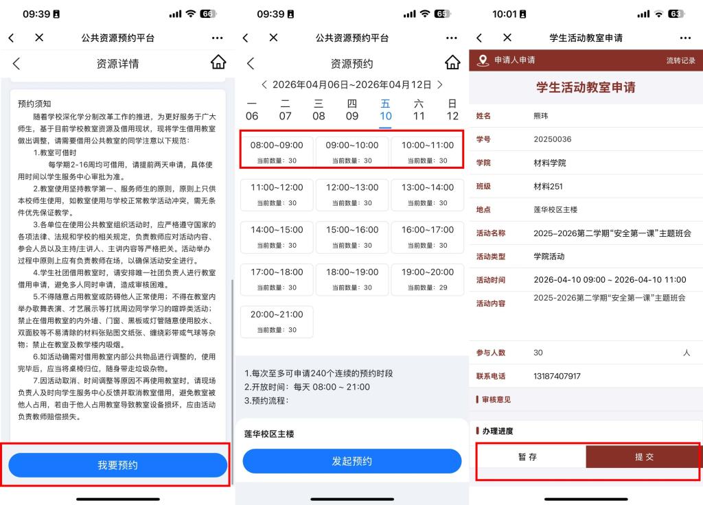 (6)发起预约后,如实填写“学生活动教室申请”单,然后点击“提交”。